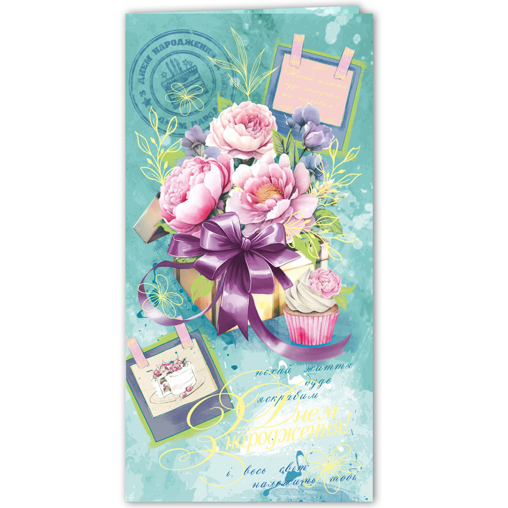 Картон щільністю 235 г/м², лице та зворот - повнокольоровий друк, тиснення золотою фольгою, у/ф лак, без тексту в середині.